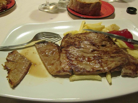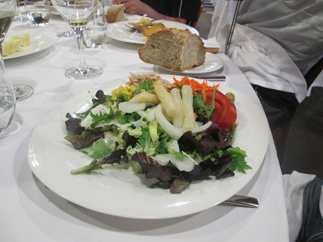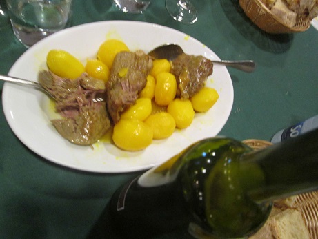 | 上の肉の塊がローストビーフと言われましたが、茹でビーフこれで1人前です 肉の一塊で十分、ジャガイモもほとんど残しました 例によって、美味しい冷たいビール、ワインは、もちろん飲み放題 |