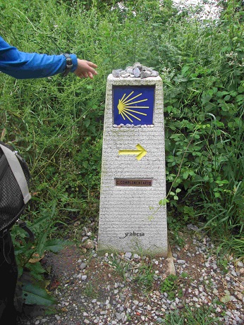 | サンティアゴの街に近くなると「巡礼の道しるべ モホン」が無くなり代わりに歩道に上のホタテ貝が道しるべになります | |