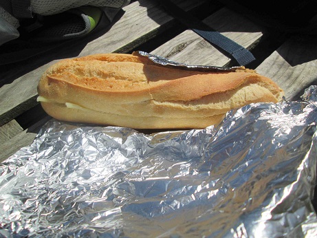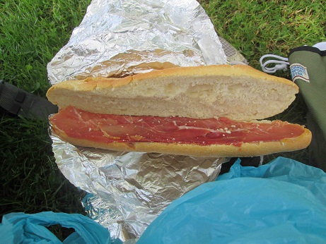 | ボカディージョ(昼食の硬いフランスパンのサンドイッチ) 左が、生ハム、右が、チーズ 硬いので歯が欠けてしまいました。 |