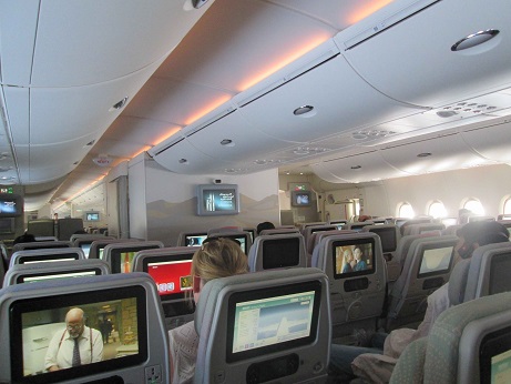 エミレーツ航空最新の2階の有るジャンボなエアバス「A380」に乗り換えて、スペインの首都マドリッドへ。ほぼ満席状態 〈所要時間〉 ドバイ/マドリッド7時間50分