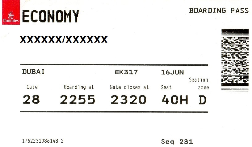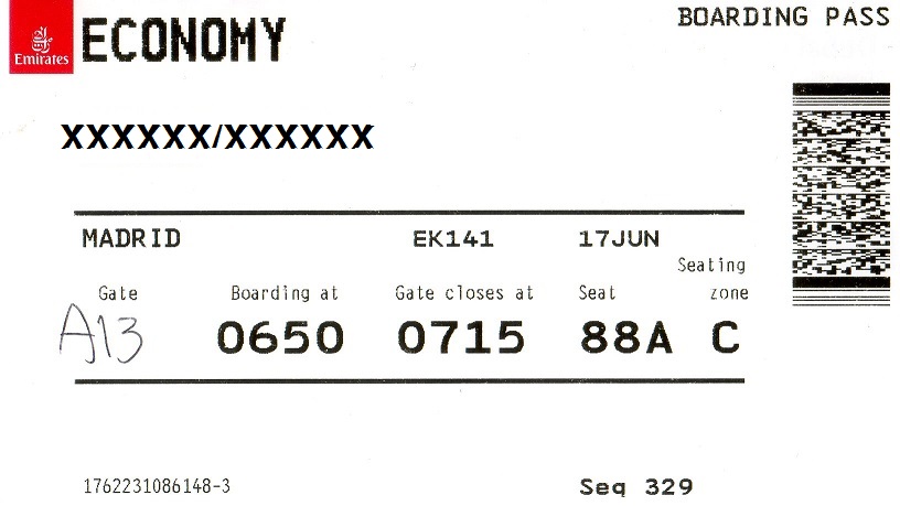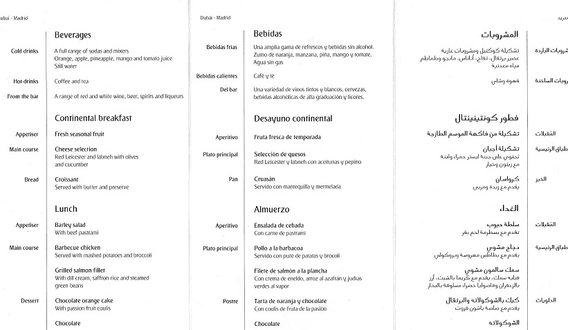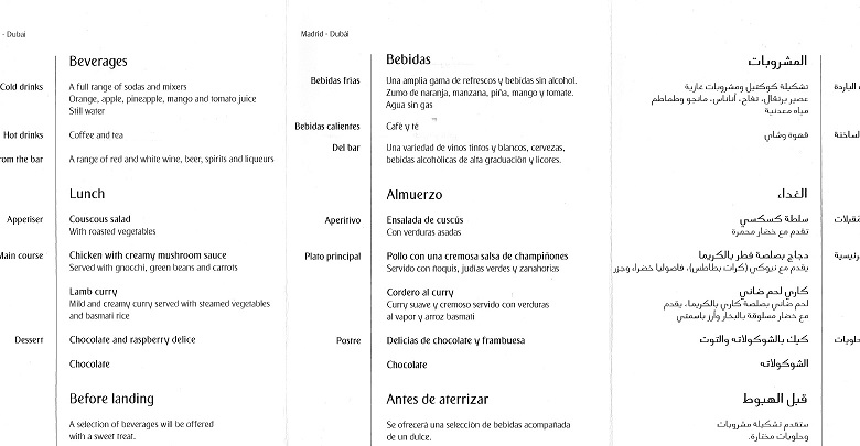 スペインの首都マドリッドからエミレーツ航空最新のエアバス「A380」に乗り換えて、ドバイへ。 エアバス「A380」は席の並びが3、4、3で席のスペースが前、横ともに広く快適でした。 |